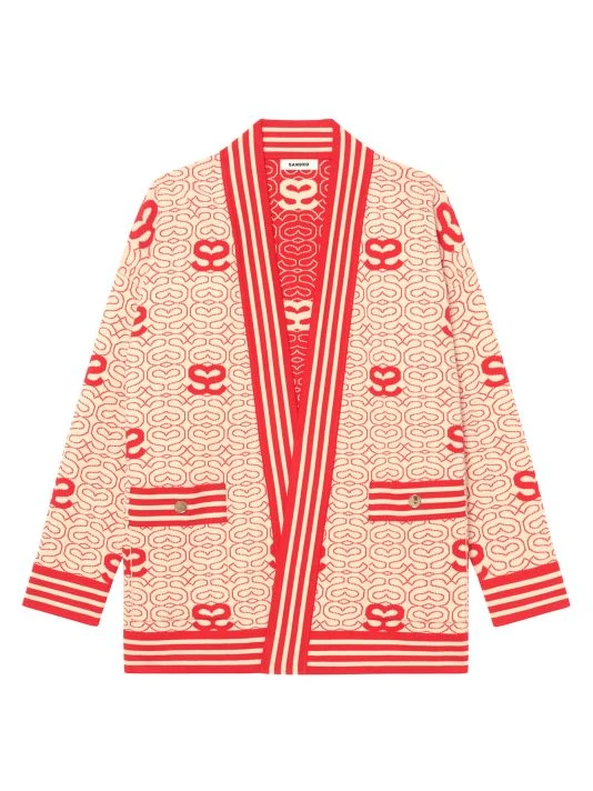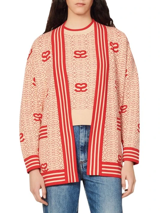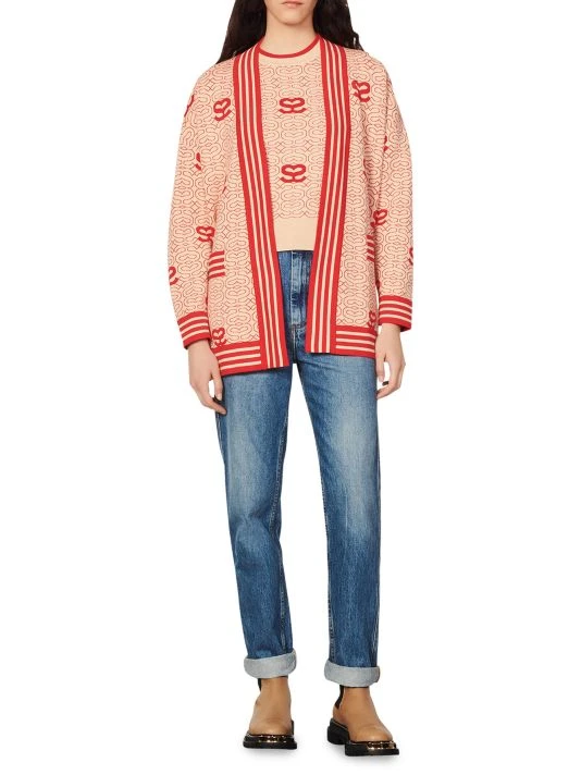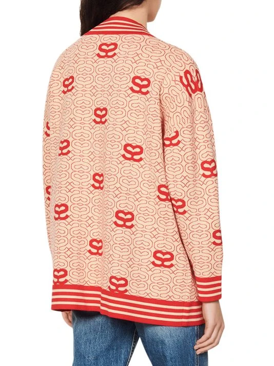 Contrast stripes trim this logo jacquard cardigan, designed with a relaxed, open-front silhouette.