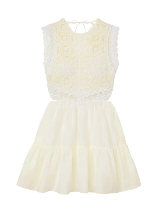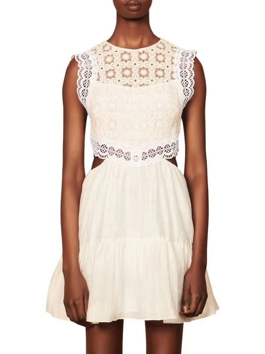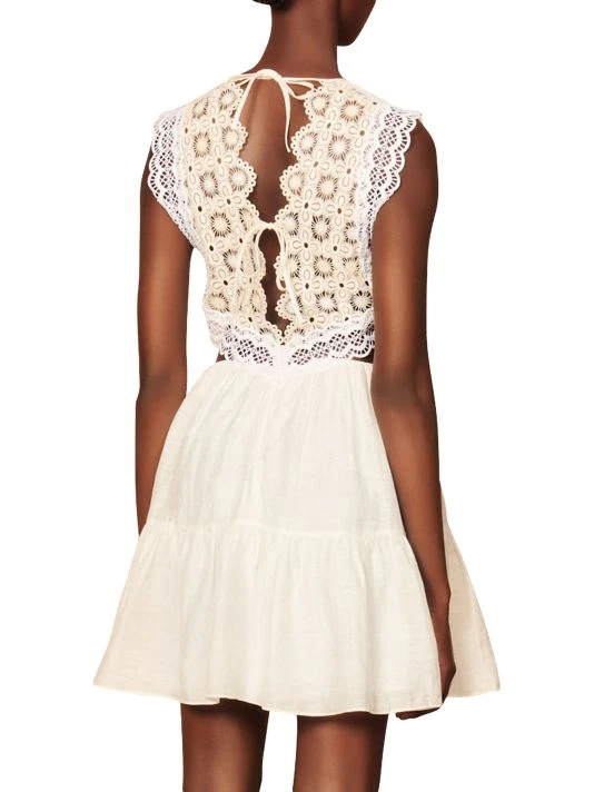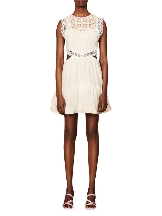Lace trims Sandro’s Isee mini dress, crafted with a guipure bodice and layered ruffle skirt.